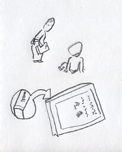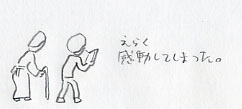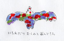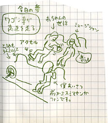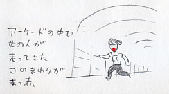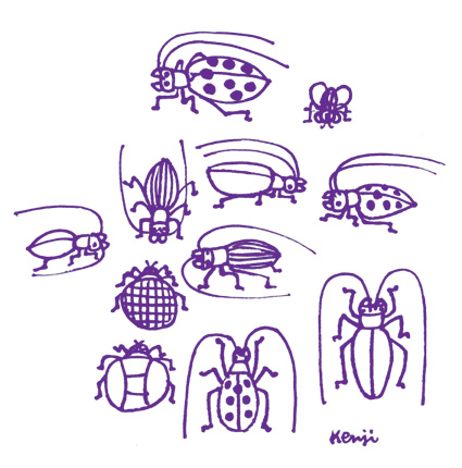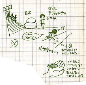 10:30頃:起床 11:10頃:家を出る 12:00頃:神宮前でYonda?打合せ お昼ごはん食べながら 15:05頃:急ぎ足で原宿のほうに 15:10頃:出版社で打合せ 10分ほど遅刻する 16:30頃:歩いて青山のビリケンにイラスト届ける こちらでも→茂田井武トリビュート展 17:00頃:大きいハンバーガー食べ、お腹がパンパンになる もう空は暗い 18:00頃〜原宿で新しいシャツを買い帰る 帰って仕事 昨日着たシャツ捨てる 10月3日 ずいぶんチョウチョに好かれているらしく 歩いていると白いのやオレンジのやつらがどんどんまとわりついてくる。 なんか恐い。サイケデリックだよ。 嫌いじゃないんだけど耳元でぱたぱたと羽音がした時、 なんか話しかけられたみたいにゾクッとした。 オートバイの修理を依頼しようと修理屋に行ったら定休日だった。やっぱりね。 真っ暗な修理屋のウィンドウに映った自分のシャツがあんまりにみすぼらしかったので 今日着て、脱いだら捨ててもいいかなと思った。 10月2日 東京はずいぶん涼しくなりました。 歩いてたら「?」が落ちていた。 よく見たら死んだミミズだった。 ぼくは歩く時、下ばかり見てるんだろうか。 先日、歩いていたらチョウチョが道路の上で苦しんでいた。 (下の写真はその時、携帯電話で撮った) チョウチョは口から黄色なストローをだして道路に何度も何度もキッスしていた。 もしかしたらのどが乾いて苦しんでいたのかもしれない。 砂糖水でもあげたら良かったかもしれないが、ぼくはそれほどやさしくはない。 そんなことより黄色なストローのこととか こどもの時チョウチョが水を飲むのを見たこととかを考えていた。 あとで見に行ったらチョウチョはいなくなっていた。 10月1日 Kenji Oikawa ![]() ![]() ![]() 9月26日 Kenji のらねこに名前を付けたり、付けなかったり いつもいるじいさんに勝手に名前を付けたり、その名前を忘れたり、 読み方のわからない漢字をなんとなくオリジナルで読んでみたり、 もう名前も忘れてしまった人の電話番号の語呂合わせだけを覚えていたり、 なんとなくなんとなくでやっている。 なんとなくはなるべく保ちたいが、保てなかったり。 そういう態度は時に先生や親を怒らせる。 そういえば僕が名前を付けてあげたじいさんは最近どうしてるんだろう。 9月25日 よりみちパン!セの打合せをしたあとは中目黒から恵比寿まで 歩いて帰るのが密かな楽しみになっている。じいさんみたいでしょう。 歩いて10分くらいかな。 部屋にいるときより、電車に乗ってるときよりひとりになれる気がする。 うまくすると0人になれた気がする時がある。 歩いてる自分もいなくなって誰でもない目だけが移動しているように感じられるのは ほとんど快感です。 9月17日 幼稚園の頃にやった劇で「切り株」の役をやってから (まあ、ただぼんやり座ってただけですが)切り株はすこし気になる存在だ。 ![]() 今日発見した切り株はなんというか中がスカスカの空洞で 色も無彩色のようになって、もう完全に死んじゃってるかんじが格好良かった。 9月6日 思ったことをふたつほど。 1. バイク便を出した後、しばらくして外に出ると たいていバイク便の人はまだ家の前でもたもたしている。 いったい何の処理に時間がかかっているのか。 外に出なかった場合でも「まだいたの?」というタイミングのエンジン音。 2. ジュースを販売機で買う際、前に飲んだ空き缶を2本そこに捨てていけば いつか必ず家の空き缶はなくなるはずだ。 でも、最後に絶対、買わないのに捨てにいくということをしないかぎり 無くならない。そしてそれが出来ない。 9月4日 案を考えれば考えるほど だんだん企画会議のアイデアマンみたいになってくる。 そんなのやだなぁ。なんかどんどん遠くにいってしまうね。 アイデアなんか見えなければ見えないほどかっこいいのにね。 なければないほど切れるのに。 病気かしら。 ろいやるほすとでぼくが超アイデアマンになってたら 今日はお友達がいた。や、知らない人だけどなんかアイデア出してた。 ぼく以外にもつまんなそうな人がいた。 8月27日 ちょっと寒い日なのでねこが丸まって固くなってた。 ニャンモナイト状態だ。 ほどこうとしたけど、ほどけなかった。 片手で持ち上げたらナイトのまま持ち上がった。 そのままカーリングみたいに廊下にむかってすっ飛ばそうかと思ったけどやめた。 かわいそうだからね。 かわいいとかわいそうはきっと同じ意味でしょう? トイレにいってもどったらねこは何食わぬ顔でほどけてた。 8月24日 今日は埼玉の北浦和というとこの美術館に行って丸木スマの絵を見てきた。 見れてよかった。 夜は雨が降って涼しかった。 夜はまるい水たまりが真っ黒くなっていて、何かに似ているなぁと思っていたら 夜のネコちゃんの目玉だった。 黒アメを舐めてる時に、いちど口から取り出してながめてみると そんなネコちゃんの目玉のような黒さです。 電車の窓のとこに立ってたらガラスに映ってる自分の姿がとても老けていた。 帰りにコ